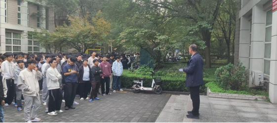 疏散演练前,为保证此次演练有序高效开展,保卫处对参与演练的组织人员在E01学生自习室进行演练前培训。消防科孙志华老师为宿舍管理人员、E01 学生公寓楼长及各楼层长等组织人员,系统讲解应急疏散的正确流程、关键注意事项,并明确各岗位人员的具体任务分工 ,确保每个环节责任到人。培训过程中,孙老师结合校园宿舍火灾案例,强调疏散演练并非 “走过场”,而是应对突发安全事件的 “实战预演”,进一步强化了组织人员的责任意识与协作意识。