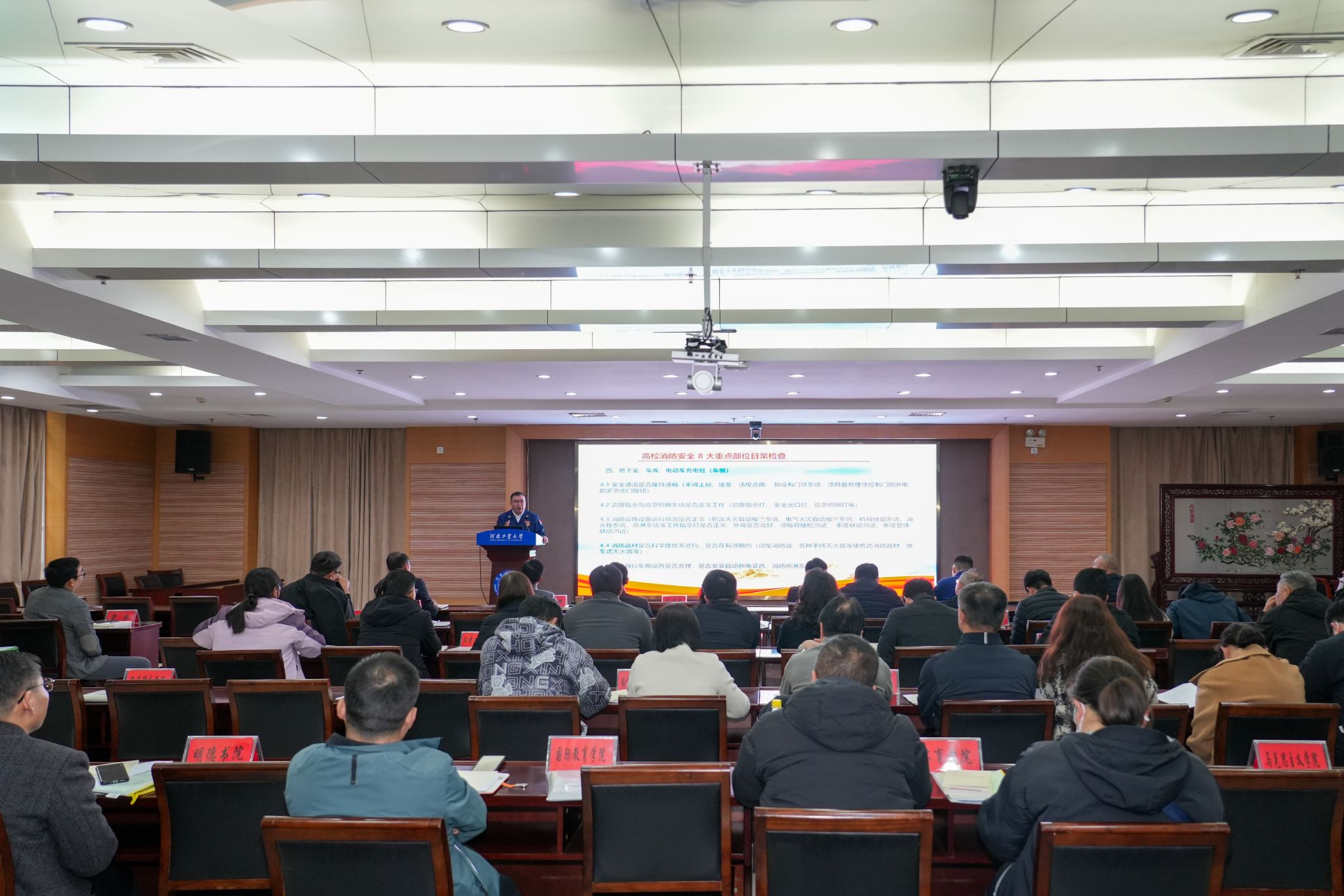 11月10日,学校在学术会议中心D102报告厅召开2025年度消防安全工作会议,传达上级关于消防安全工作的相关文件精神,开展消防安全知识培训,部署学校消防安全工作。副校长牛进平出席会议,学校各职能部门主要负责人、各学院主要负责人及消防安全联系人参加会议,会议由校长办公室(安全生产办公室)副主任杨伟超主持。
