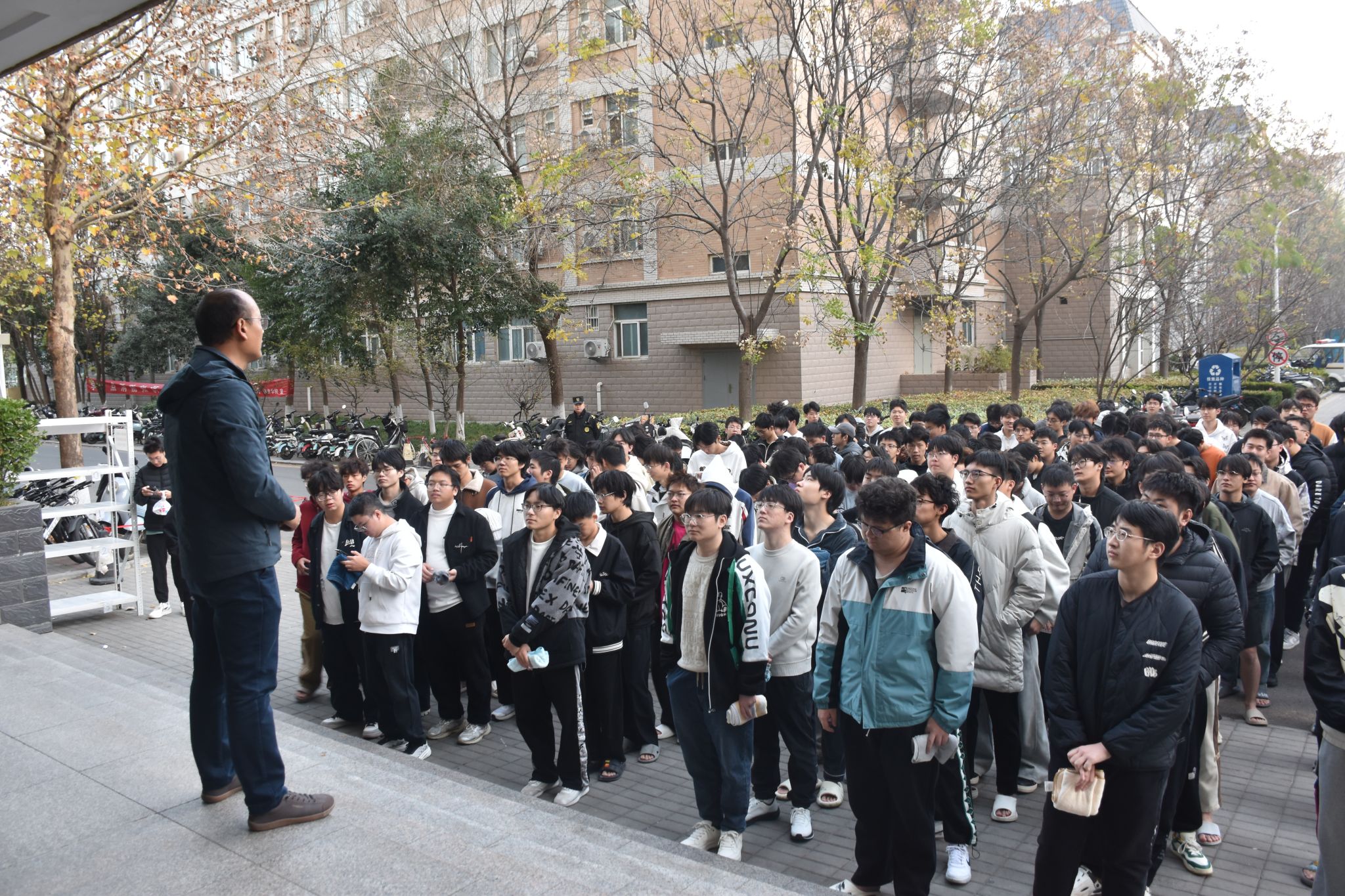 保卫处还联合后勤服务中心在F01学生高层公寓开展了应急疏散演练。此次演练模拟真实火灾场景,不提前通知宿舍管理人员及参加演练学生的具体时间,随着宿舍楼模拟起火点触发烟感报警器,应急预案随机启动,消防控制室值守人员、保卫处消防工作人员、宿舍管理人员、楼长、楼层长先后按制定的灭火与应急疏散预案开展行动。宿舍管理人员迅速畅通楼宇的各安全出口,引导学生快速疏散至楼外,由各楼层长、寝室长组成的“义务消防小分队”迅速组织同学们疏散,同学们用湿毛巾捂住口鼻,沿着疏散楼梯快速向楼外撤离,保卫处消防工作人员随机赶赴现场,开展灭火、协助疏散等行动。疏散过程中,宿舍管理人员不断提醒学生们“不要拥挤”“捂住口鼻”,避免发生踩踏风险。仅用时5分钟左右,参与演练的全体学生便安全撤离至宿舍楼前广场,随后迅速清点人数并上报,确保无一人“遗漏”“受伤”。
