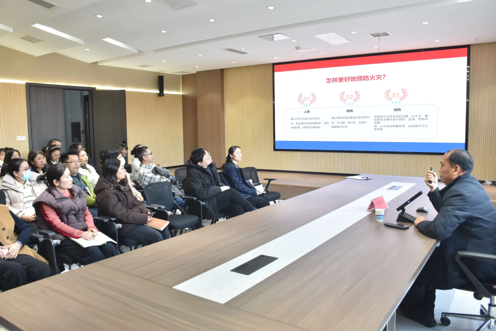 保卫处联合图书馆开展消防安全培训和疏散演练。保卫处副处长李芳炎作消防安全辅导报告,他围绕火灾成因,结合真实火灾事故案例和相关法律法规,对火灾预防、初期火灾扑救和疏散逃生等基本理论和相关要求进行了系统地分析和解读,帮助参训人员增强火灾风险隐患的识别和自防自救的认知。培训期间,针对参训人员不熟悉使用逃生面具的情况,保卫处工作人员现场示范讲解了逃生面具、防毒面具的正确佩戴方法及核心特性。培训会后,双方又联合开展灭火及疏散逃生演练。演练活动完全模拟真实火灾场景,随着急促的声光报警信号与应急广播指令响起,图书馆值班人员第一时间启动应急响应,按照应急预案要求,各组人员根据分工迅速开展模拟起火点灭火、组织各部位人员疏散逃生等行动,消防科人员、安保人员接到模拟报警后迅速赶赴现场,分别开展灭火、协助疏散、现场警戒等行动。演练结束后,双方对演练进行了复盘,总结演练中存在的问题与不足,并提出优化建议。
