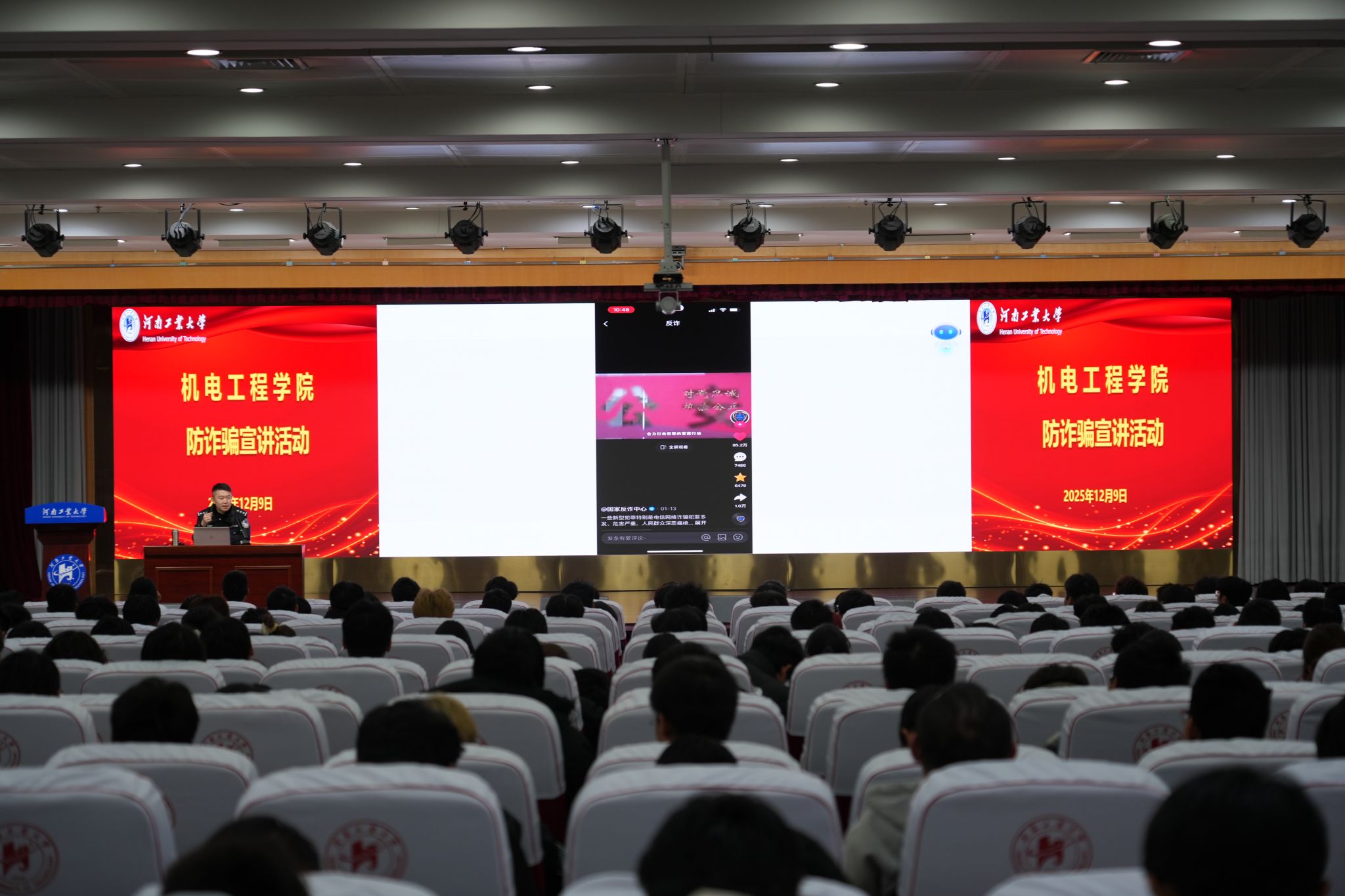 为进一步提升全院师生反诈防骗意识与自我保护能力,有效遏制校园电信网络诈骗案件的发生,12月9日,机电工程学院邀请市公安局高新分局反诈大队民警吴昊走进校园,开展反诈宣传专题活动。活动由保卫处副处长李磊主持,学院党委副书记张东霞、辅导员杨贞贞、谢亚杰及近500名学生代表到场参与。